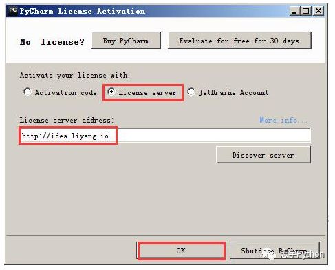 之后在License server address中随意输入下面两个注册码中的任意一个即可,Pycharm新注册码1:http://idea.liyang.io或pycharm新注册码2:http://xidea.online,之后点击OK,便可以激活Pycharm了。