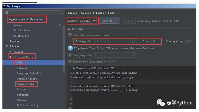 这个界面是Pycharm默认的界面,大家完全可以自己去setting中设置自己喜欢的背景和字体大小、格式等等。