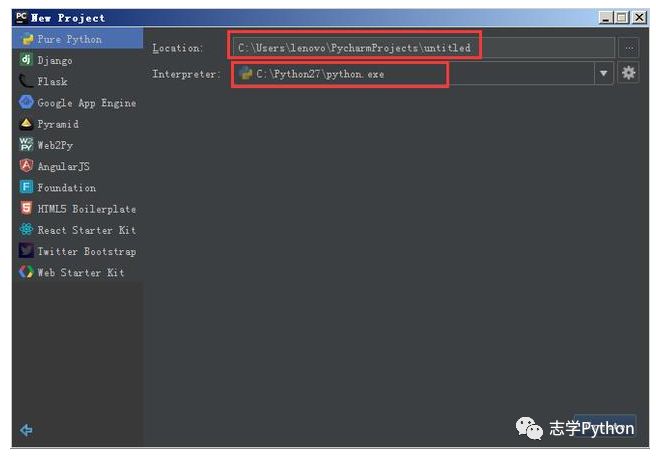 自定义项目存储路径,IDE默认会关联Python解释器。选择好存储路径后,点击create。