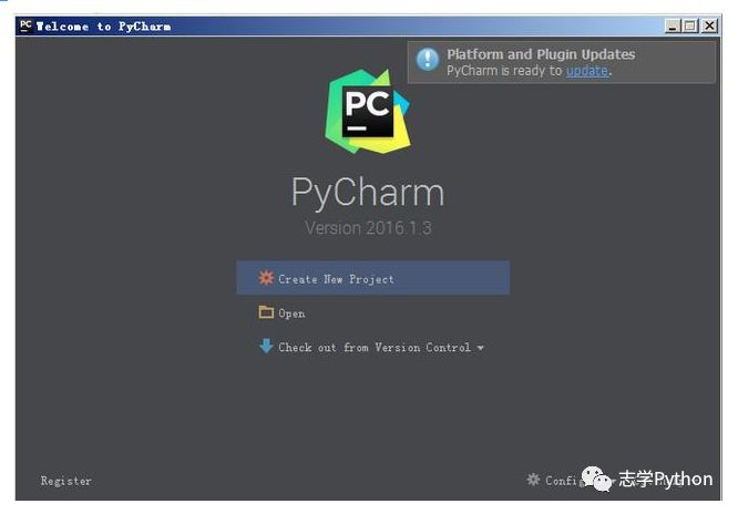 7、点击Finish,Pycharm安装完成。接下来对Pycharm进行配置,双击运行桌面上的Pycharm图标,进入下图界面: