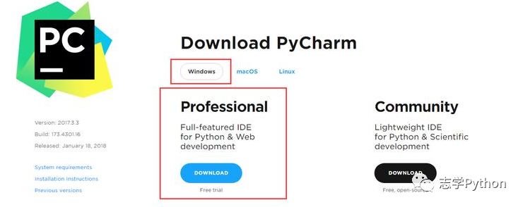 1、首先去Pycharm官网,或者直接输入网址:http://www.jetbrains.com/pycharm/download/#section=windows,下载PyCharm安装包,根据自己电脑的操作系统进行选择,对于windows系统选择下图的框框所包含的安装包