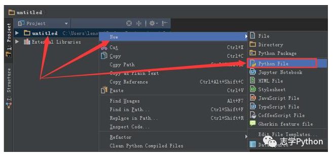 18、进入的界面如下图所示,鼠标右击图中箭头指向的地方,然后选择New,最后选择python file,在弹出的框中填写文件名(任意填写),本例填写:helloworld。