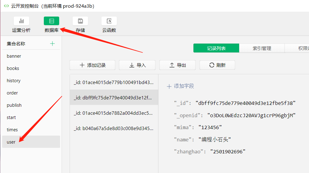 在云开发管理后台,点击数据库,然后点击 + 号,添加user集合(数据表),如下图