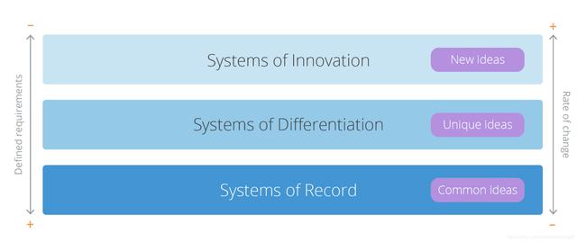 我们可以应用 Gartner 的 Pace Layer 来理解为什么要有中间层,这样可以更好地理解中台的定位和价值。Pace Layer 里提到,可以按照事物变化的速度来分层,这样可以逐层分析并设计合理的边界与服务。