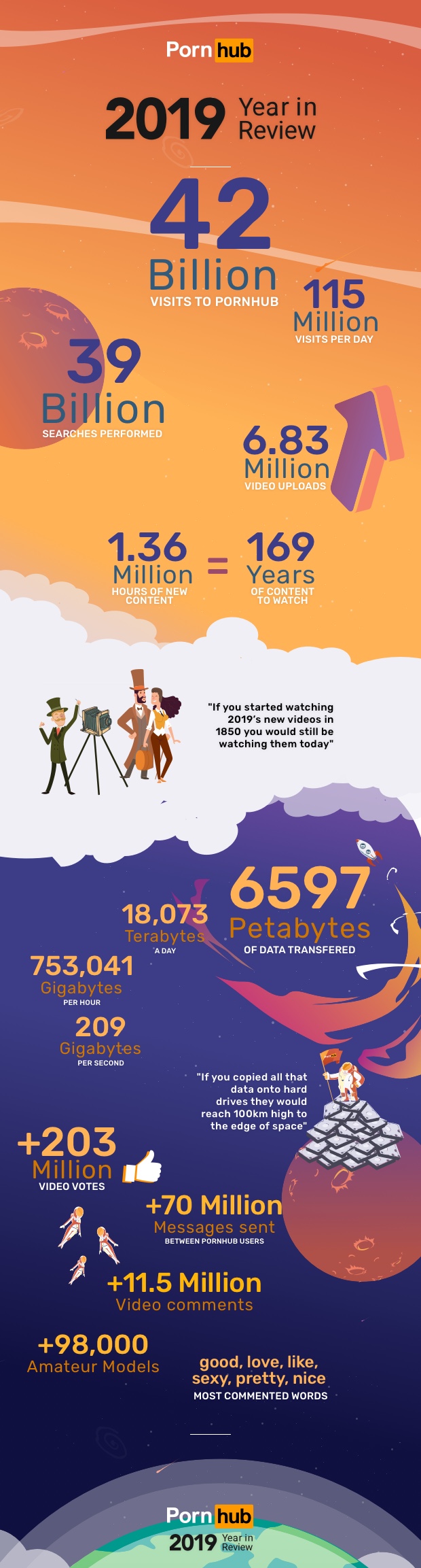 在 2019 年,视频上传量达到了创纪录的水平,超过 683 万个新视频上传到了 Pornhub。换一个角度看,如果你将 2019 年的所有新视频内容串在一起并在 1850 年开始观看,到今天你还看不完!
