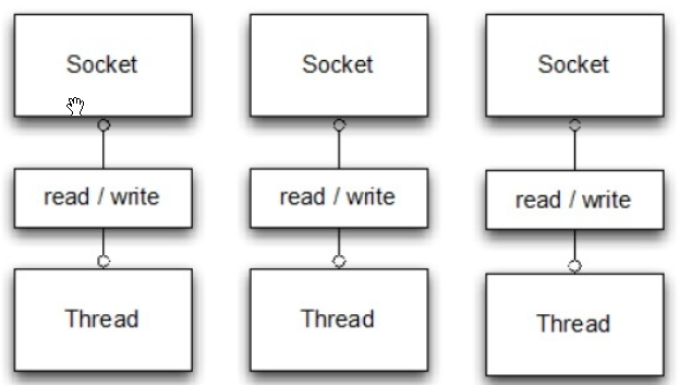 采用 BIO 通信模型 的服务端,通常由一个独立的 Acceptor 线程负责监听客户端的连接。我们一般通过在while(true) 循环中服务端会调用 accept() 方法等待接收客户端的连接的方式监听请求,一旦接收到一个连接请求,就可以在这个通信套接字上进行读写操作,此时不能再接收其他客户端连接请求,只能等待当前连接的客户端的操作执行完成, 如果要让 BIO 通信模型 能够同时处理多个客户端请求,就必须使用多线程(主要原因是socket.accept()、socket.read()、socket.write() 涉及的三个主要函数都是同步阻塞的)