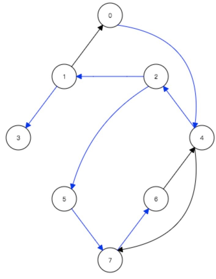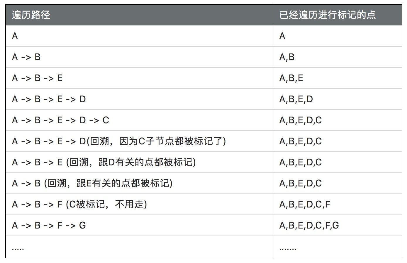 如上图,从任何一个顶点开始,这里从 0 ,随机一个方向走下一步,将遍历过的点标记,以后不再走,直到走到尽头,再回退(回溯)一个点,这样我们就可以实现深度优先的遍历。