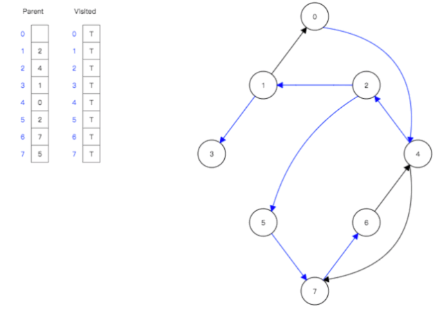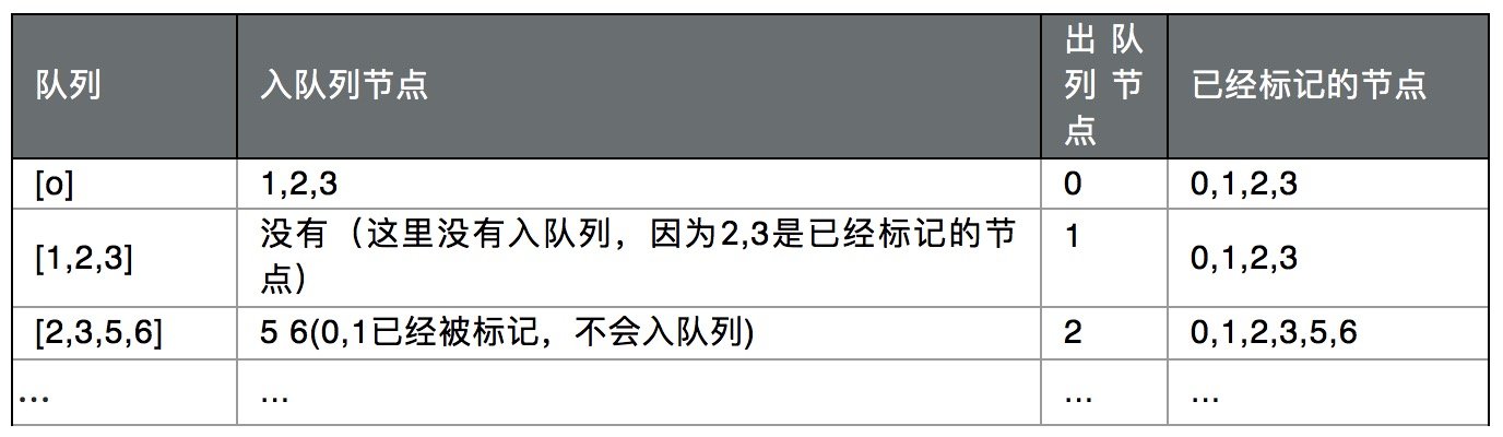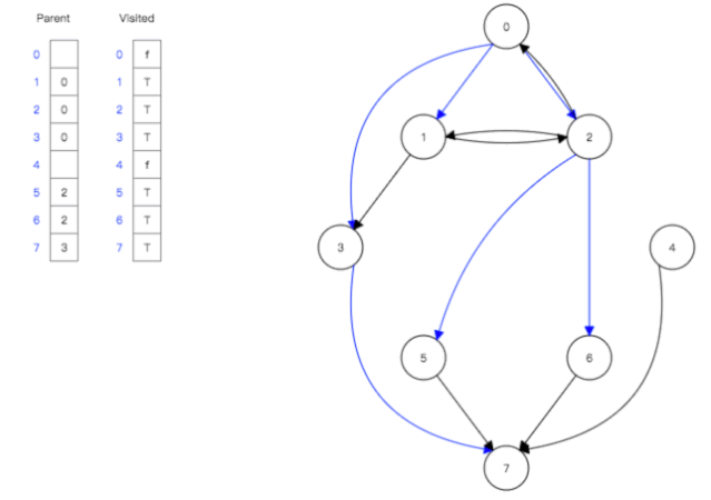 如上图有两个数组,左边用一个数组记录了遍历的路径,索引是节点,值是父节点位置,右边的数组记录了是否已经标记过,T 代表是,f 代表否。
