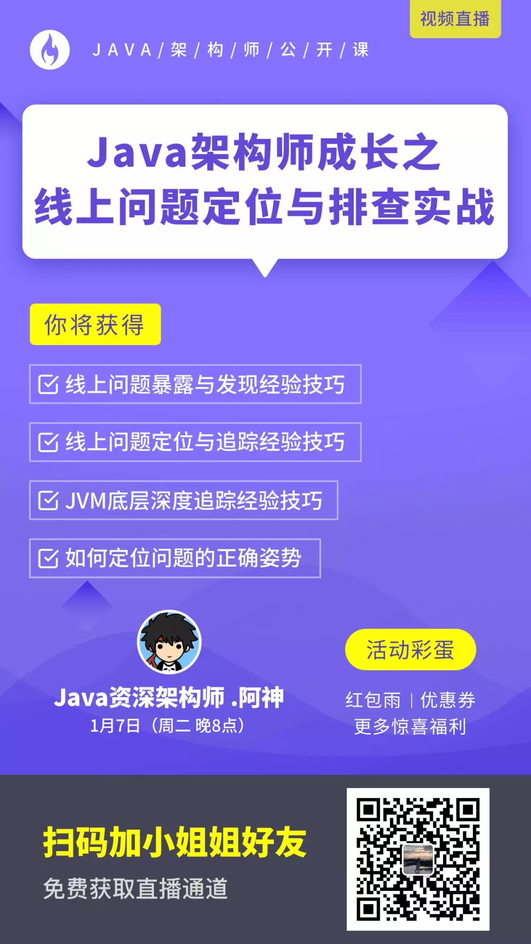 1月7号晚,特邀《Java架构师成长直通车》课程中的阿神老师,给大家带来一场干货直播;直播讲解:Java架构师成长之线上问题定位于排查实战。