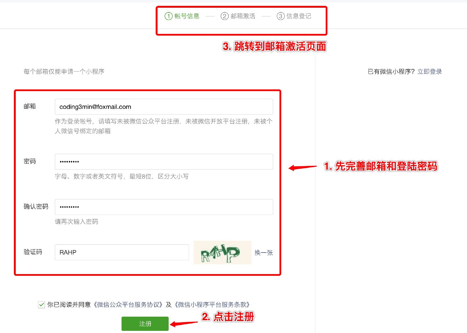 填写一个没有注册过公众号,也没有注册过小程序的邮箱,来注册。