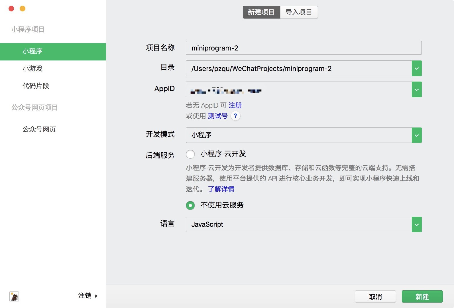 按照我的选择,名称目录任意, AppID 在上面“4. 完善小程序信息”中有讲解,暂时选“不使用云服务”,后面的文章会有讲解。点击右下角新建。