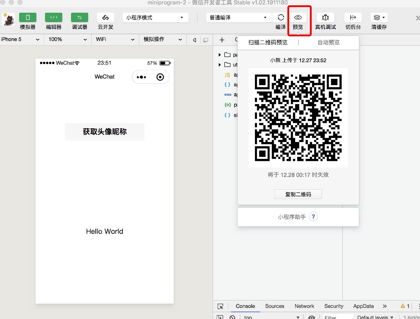 直接点击预览,你的第一个小程序就完成了,和朋友炫耀一下吧!