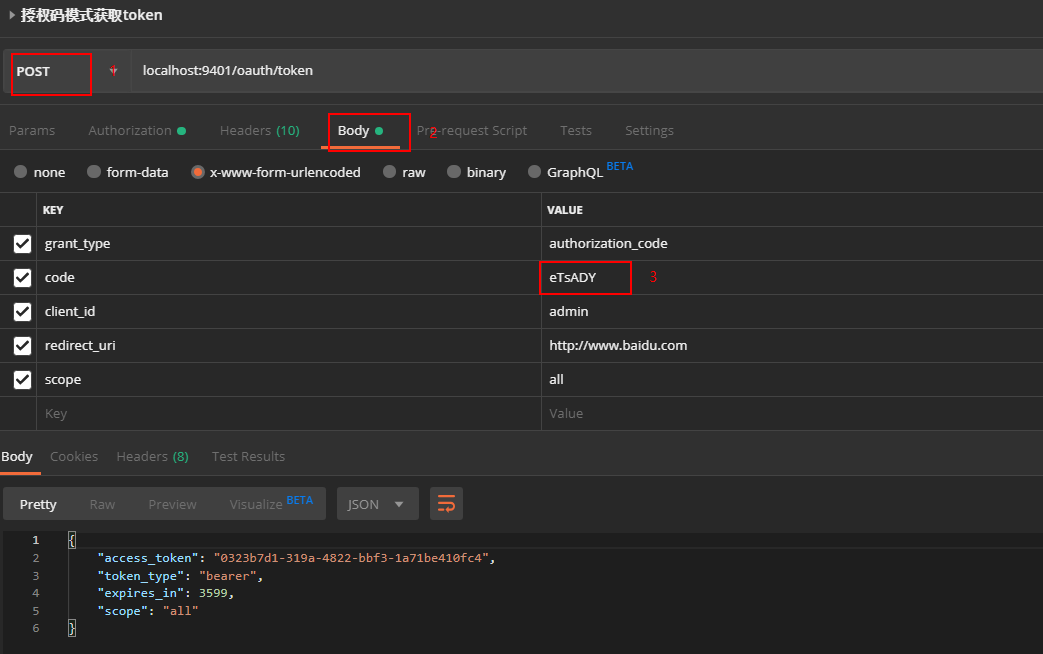 使用授权码请求该地址获取访问令牌:http://localhost:9401/oauth/token