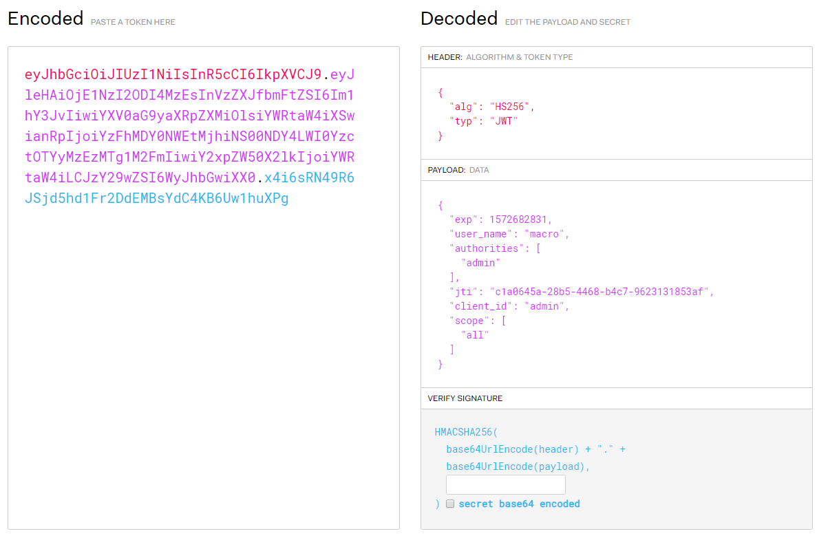 - 发现获取到的令牌已经变成了JWT令牌,将access_token拿到https://jwt.io/ 网站上去解析下可以获得其中内容。