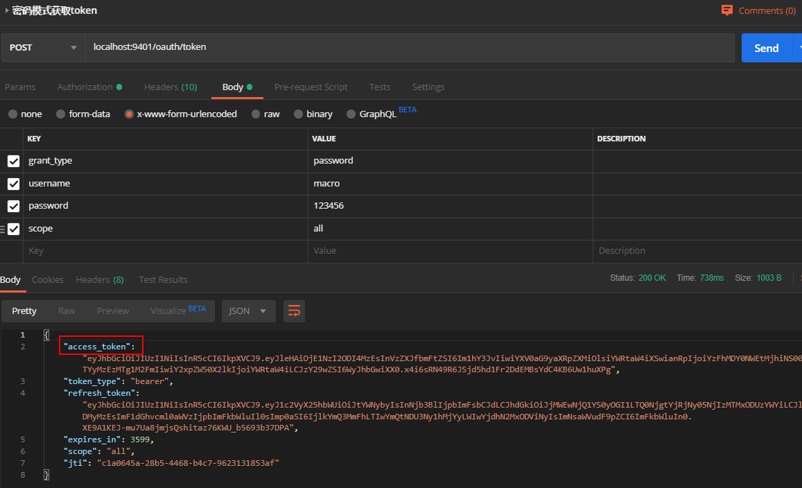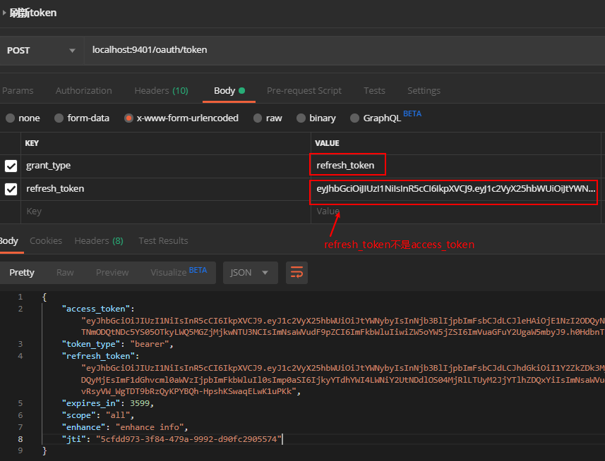 - 使用刷新令牌模式来获取新的令牌,访问如下地址:http://localhost:9401/oauth/token