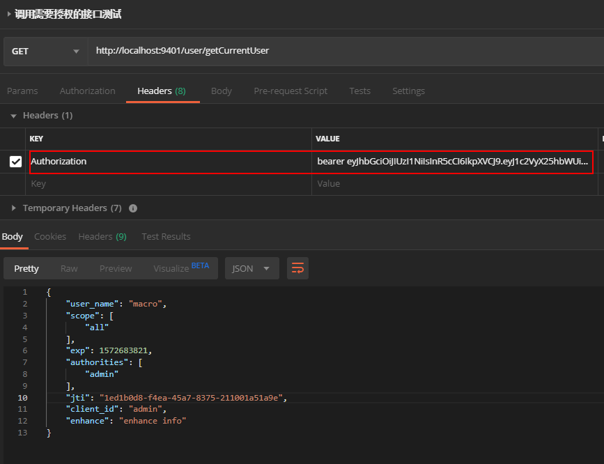 Authorization头中,访问如下地址获取信息:http://localhost:9401/user/getCurrentUser