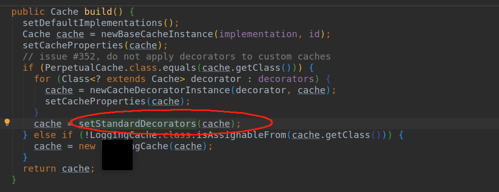 - 由上面代码我们得知mybatis会创建一个缓存对象。里面具体是通过一个build方法来创建的。我们在来看看build方法里是啥东西。