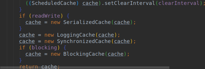 - 在之前我们了解到的`PerpetualCache`是缓存链上最基本的缓存类。我们自定义的缓存就是替代这个类的。在mybatis中会现根据我们注册进来的类进行实例化。如果没有则用默认的`PerpetualCache`这个类作为基础缓存类。