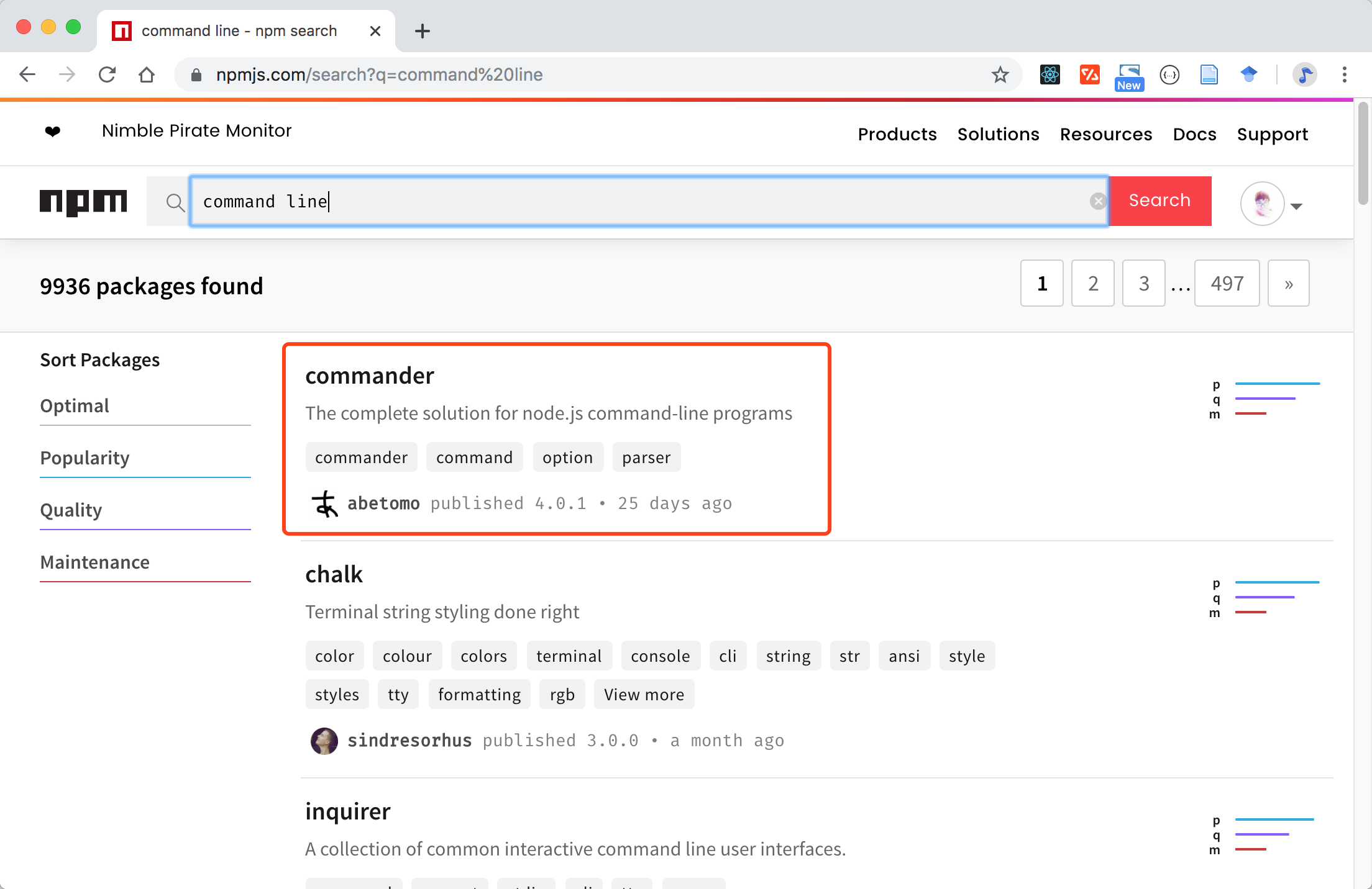 在安装我们需要的 npm 包之前,我们需要去探索一下有哪些包可以为我们所用。通常,我们可以在 npm 官方网站 上进行关键词搜索(记得用英文哦),比如说我们搜 command line: