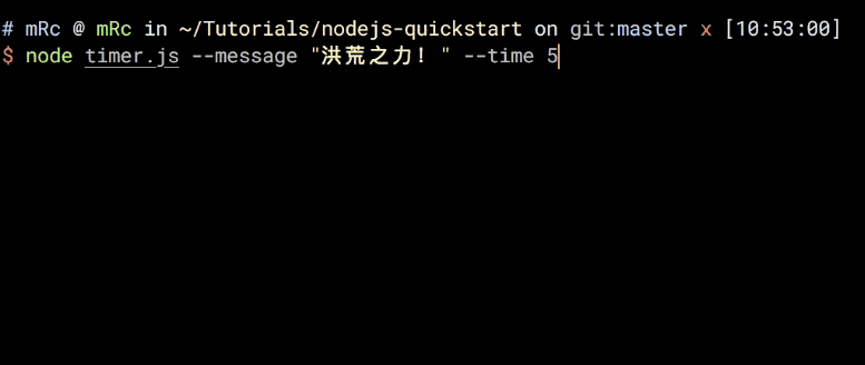 $ node timer.js --message "洪荒之力!" --time 5
