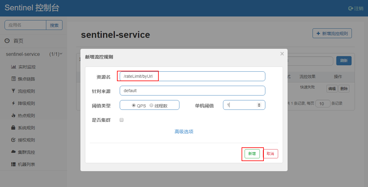 - 在Sentinel控制台配置流控规则,使用访问的URL: