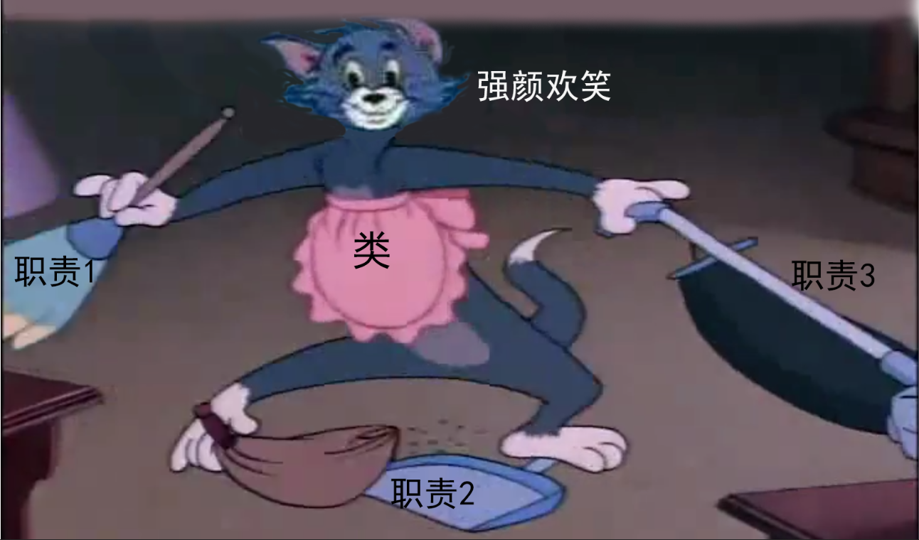 一个类开放几十个接口,绝对存在职责过多的问题,就像图中的Tom猫一样手忙脚乱,一个类的职责过多也有巨大问题: