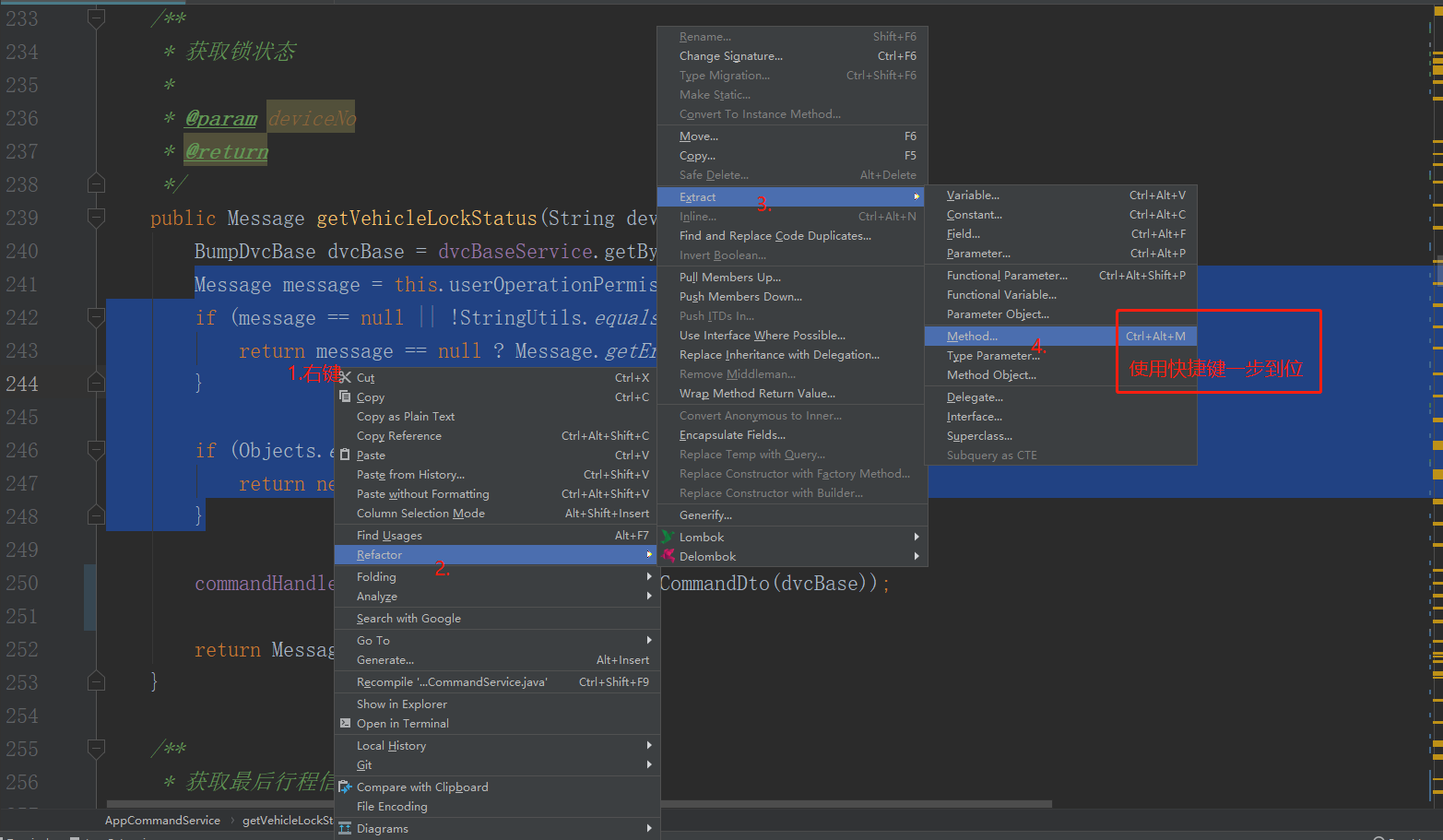 进行方法抽取 右键->选择重构->抽取->方法 (或者直接使用快捷键Ctrl + Alt + m)