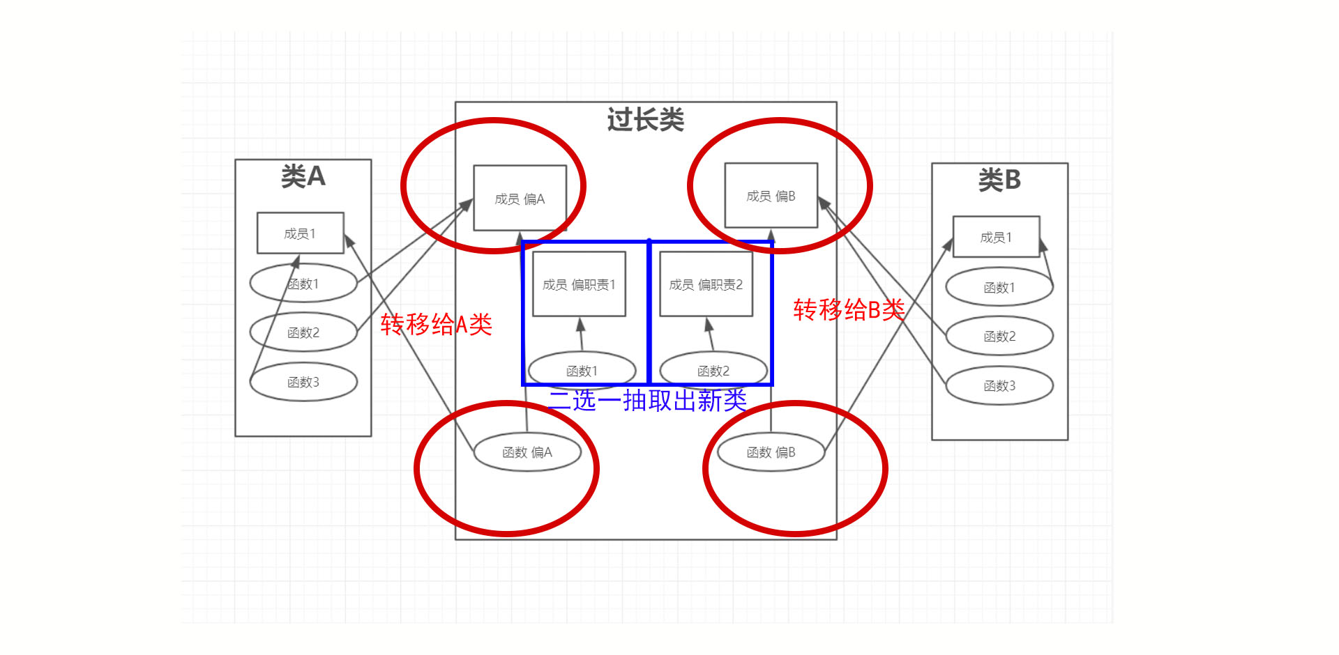 - 职责1(函数【1】和成员【偏职责1】)和职责2(函数【2】和成员【偏职责2】)由于找不到可转移的合适的类,所以应抽取出一个新的类