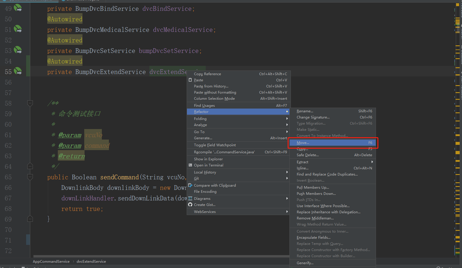 移动成员变量,鼠标选择成员变量->右键->Refactor->Move,然后选择转移至哪个类