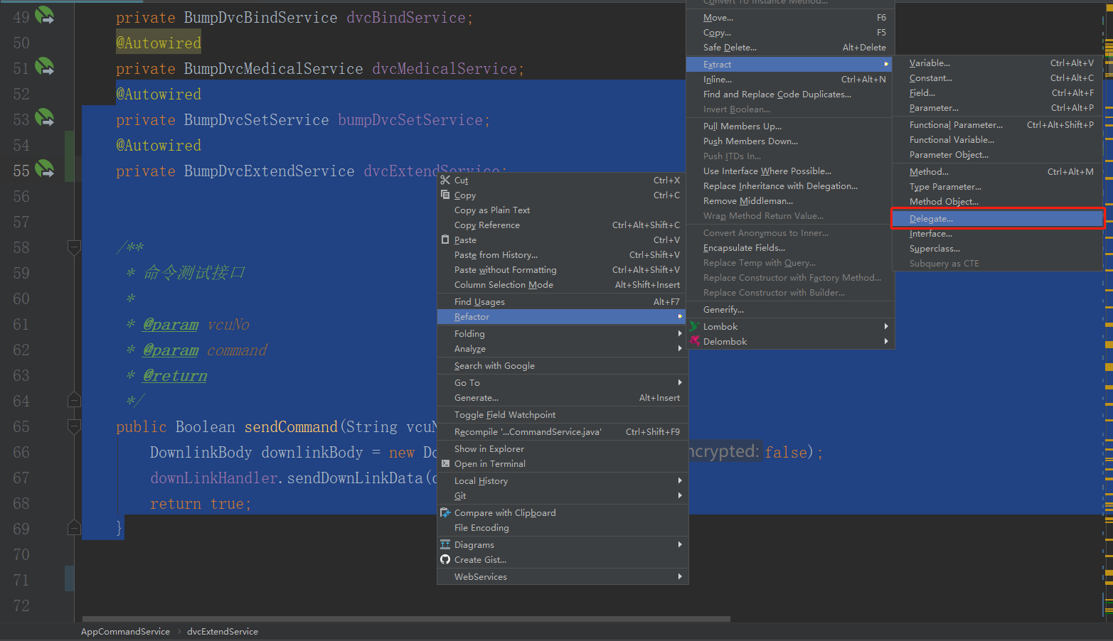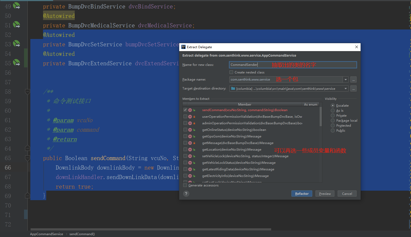 重构 选中要搬的成员变量和函数,右键->Refactor->Extract->Delegate(抽取一个委托者,委托他来管理这部分变量和函数,如果只有变量或只有函数,可以抽出参数对象Paramater Object或方法对象Method Object)