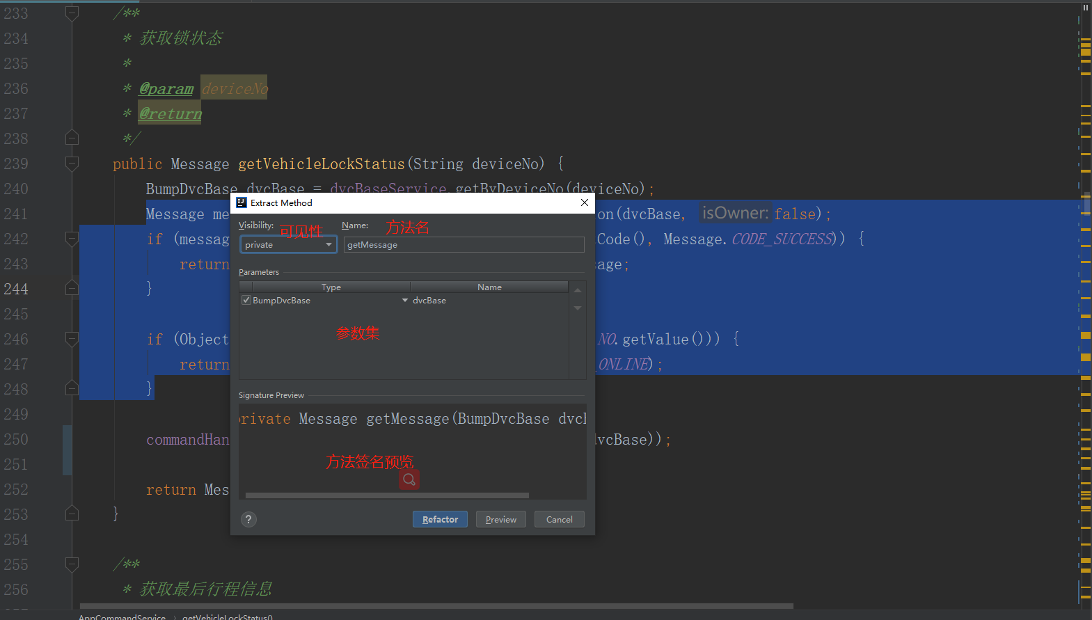 如果你对抽取出的方法的名字、参数、返回值或是修饰符不满意,不要使用Ctrl + R 修改,IDEA提供了重构方法——更改签名(快捷键Ctrl + F6)