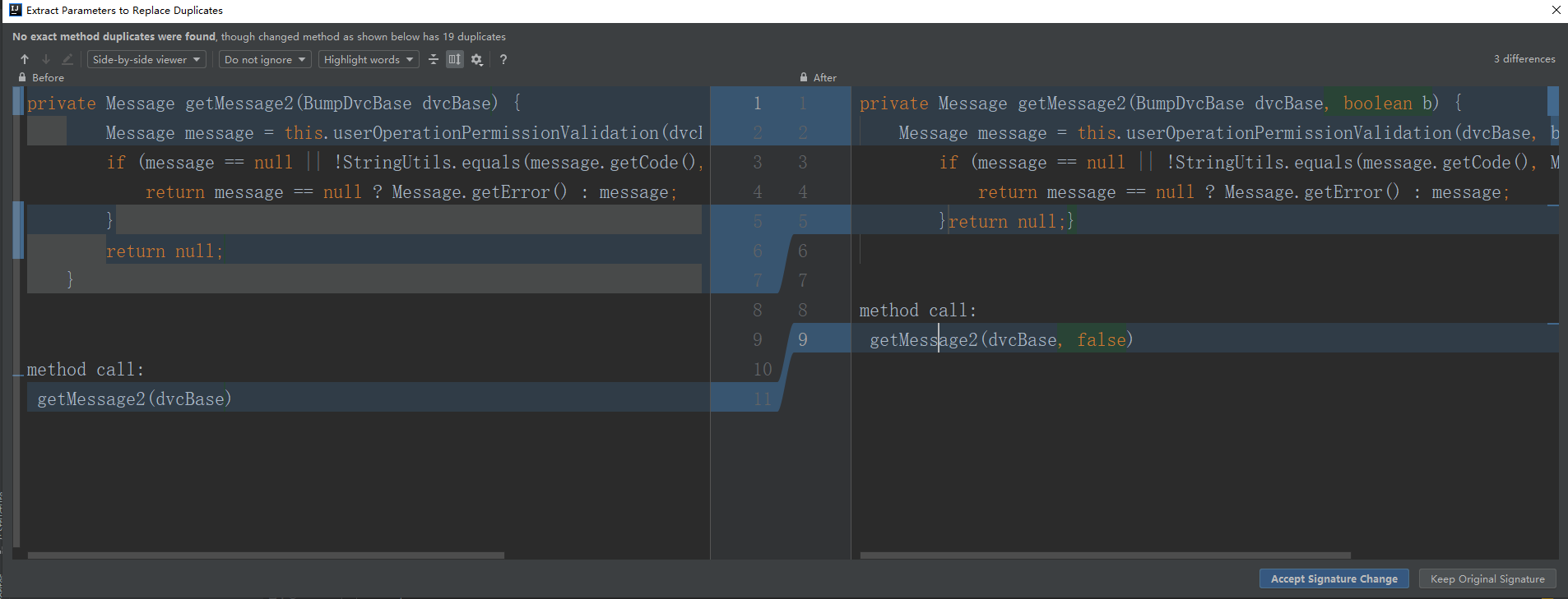 自动检测出个别重复代码的细微差别,有些代码可能只改动一两个变量,IDEA会自动检测出来,并在抽取方法时提醒我们,选择左侧Accept Signature Change(接受签名变动)可以使抽取的方法自动替换更多的重复点