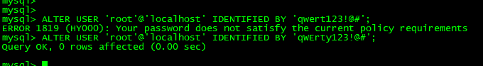mysql>ALTER USER 'root'@'localhost' IDENTIFIED BY 'QWErt123!@#';
