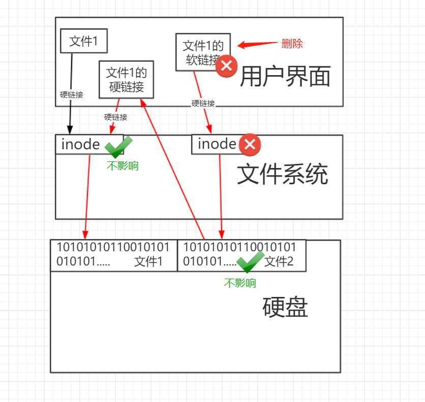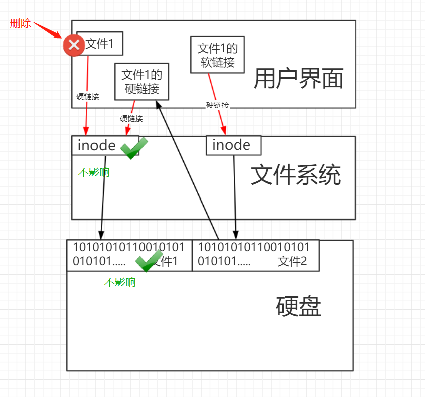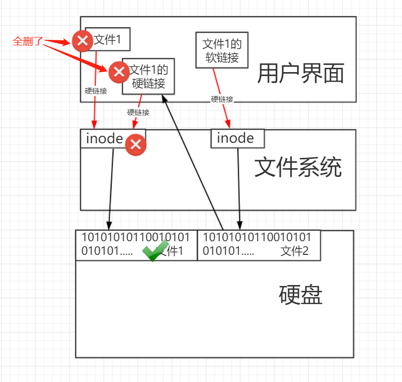当我们在用户界面删除文件时,其实只是删除了inode的一个硬链接,只要硬链接没有归0,inode不会被删除