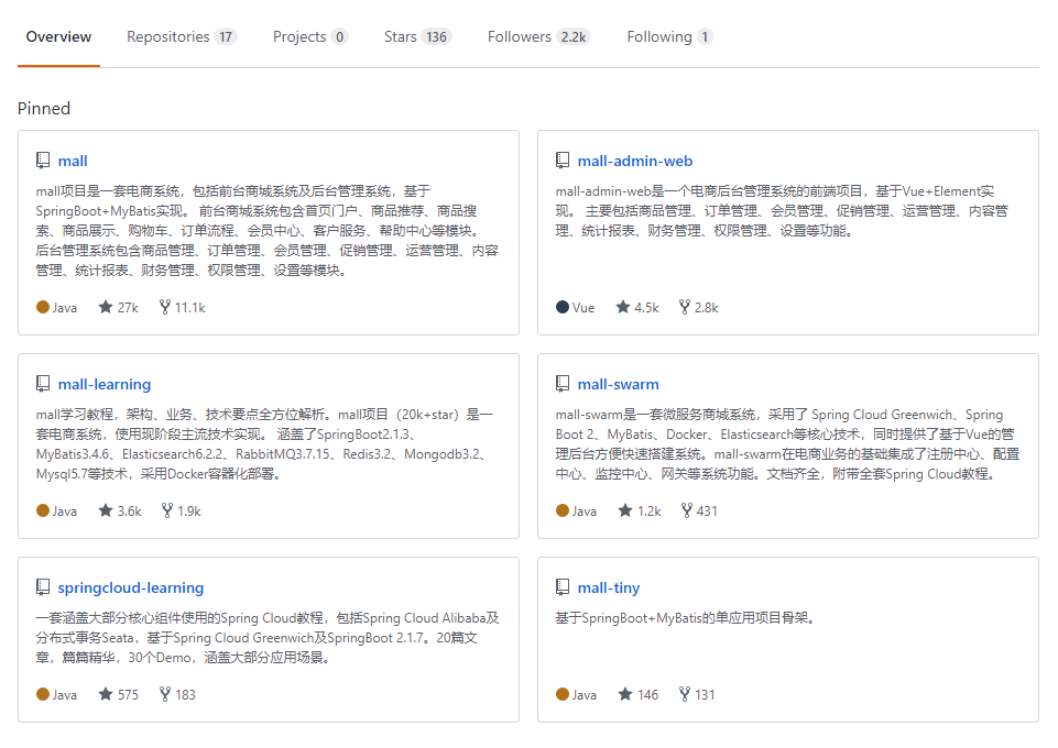 首先我们来说说mall这个项目,mall是一套电商系统,基于SpringBoot+MyBatis实现,采用Docker容器化部署。这个项目是我去年3月份开始写的,耗时9个月,到去年12月的时候正式开源。这是我的第一个开源项目,也是一个从零开始的项目,整个项目的需求分析、后台功能的实现、前端页面实现、移动端原型设计都由我一个人来完成,其中的使用的很多技术和工具都是现学现用,收获很大。这个项目开启了我的开源之路,我觉得围绕这个项目我可以打造很多有价值的东西,毕竟互联网上的实战型项目太少了,而文档齐全的项目更少,于是我便努力把它打造成一个学习型项目,于是便有了接下来的一系列开源项目。