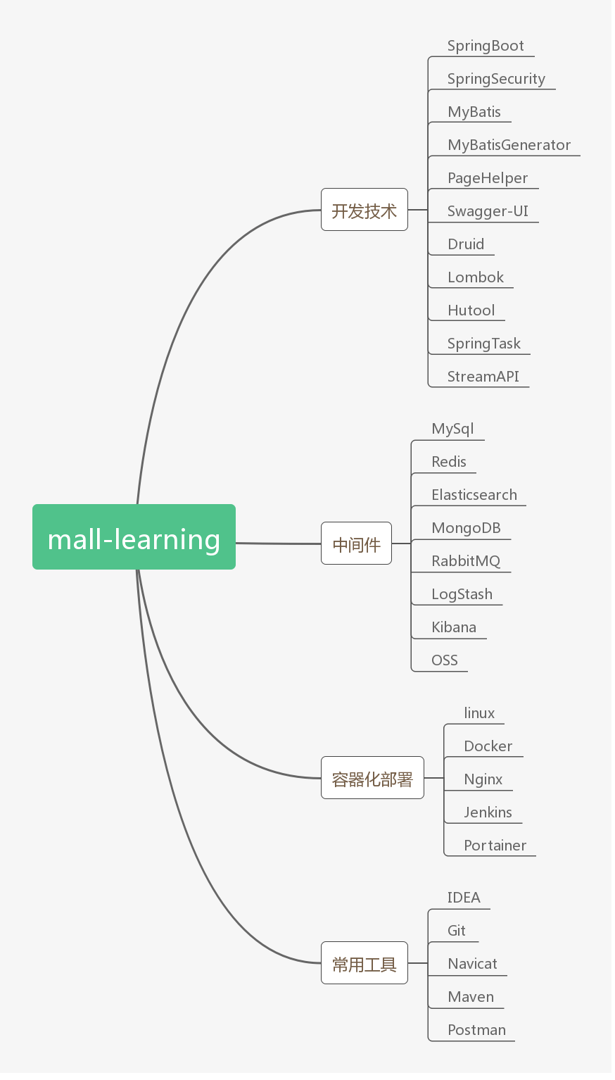 可以说基本上mall项目整个后端技术栈的文档都在里面了,这些文档不仅在学习时有用,在做项目的时候也非常有用,有些时候某些技术忘了怎么使用了,我也会来翻看这些文档,毕竟好记性不如烂笔头啊。