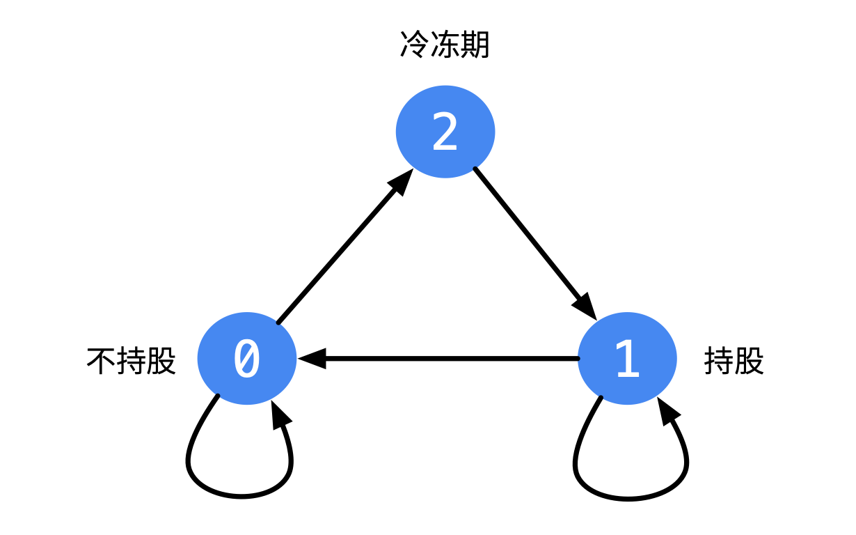 - "冷冻期"状态只能是昨天刚买了股票,也就是"不持股"状态转移过来。