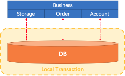 让我们想象一下传统的单片应用程序,它的业务由3个模块组成,他们使用单个本地数据源。自然,本地事务将保证数据的一致性。