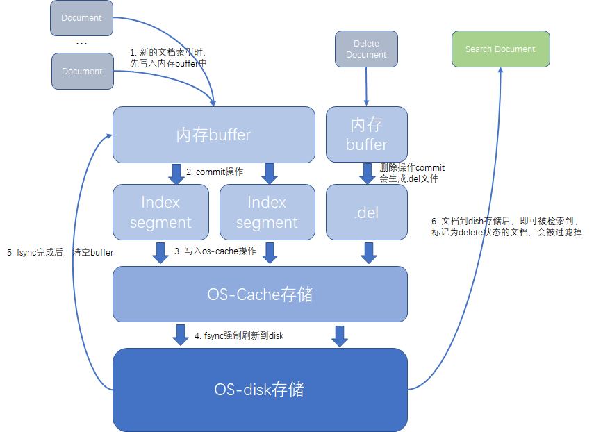 - 写入磁盘完成后,新的index segment被打开,此时segment内的文档可以被搜索到。