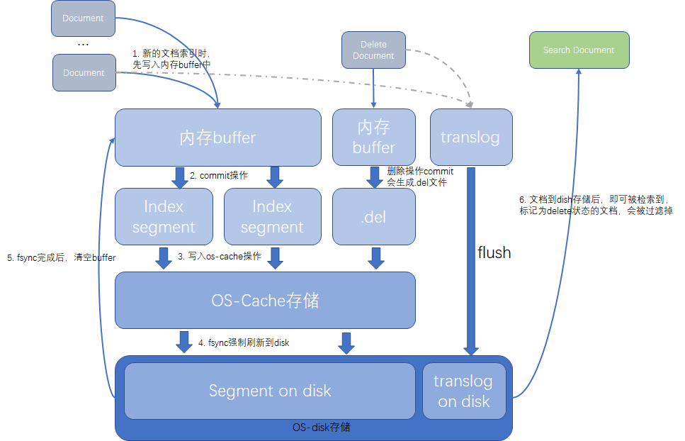 index segment信息写入到os-cache中,即完成上面的第4步,该segment内的文档信息就可以被搜索到了。fsync操作就不立即执行了,
