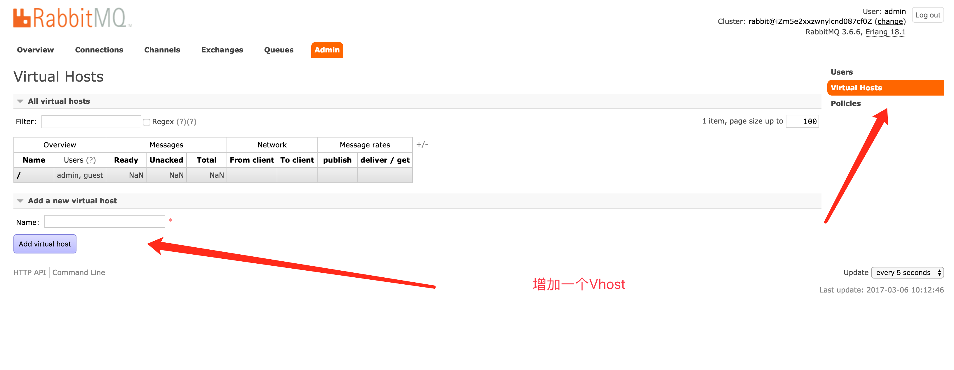 用户管理可以看到现在的用户列表,以及各个用户可以操作的vhost