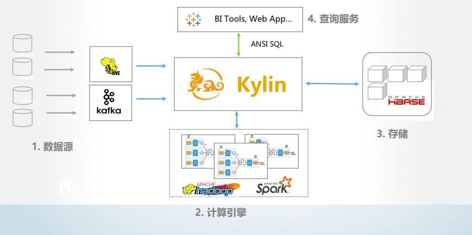 OLAP引擎:Kylin是为减少在Hadoop/Spark上百亿规模数据查询延迟而设计 Hadoop ANSI SQL接口:Kylin为Hadoop提供标准SQL支持大部分查询功能- 交互式查询能力:通过