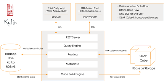 其中数据源主要是Hive、Kafka;计算框架默认为MapReduce,也支持Spark;结果存储在HBase中;对外查询接口支持REST API、JDBC、ODBC。