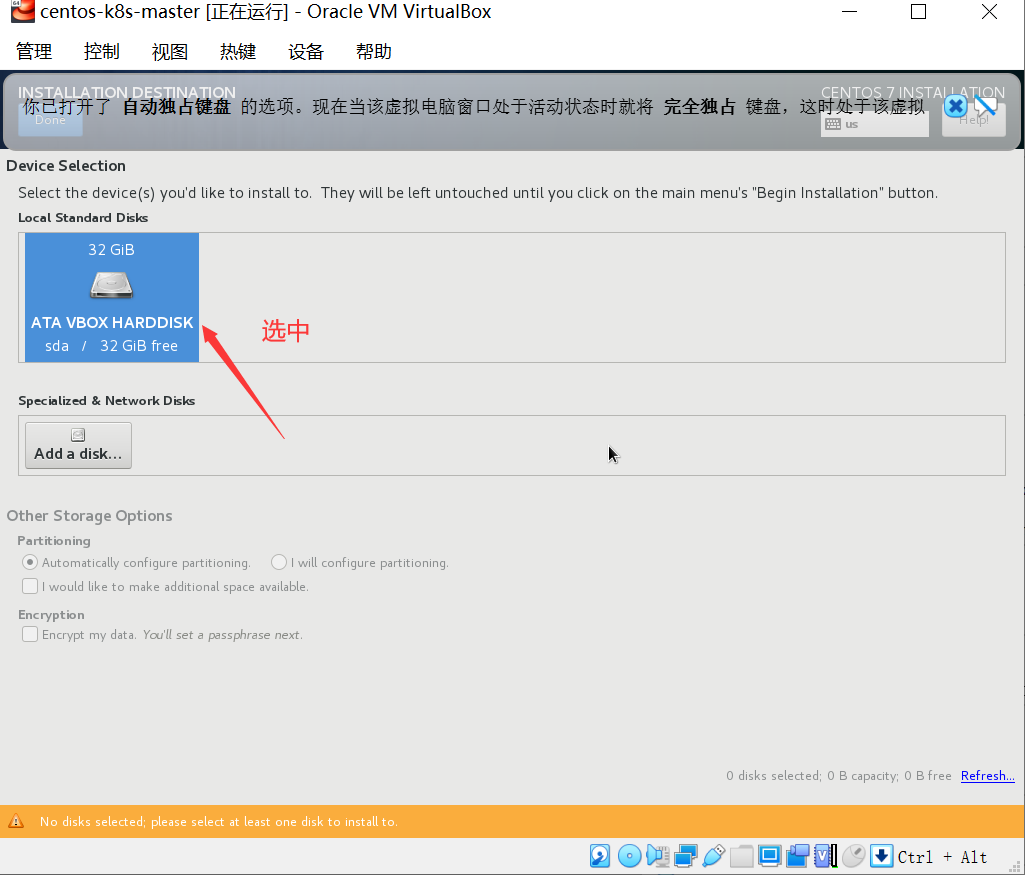- 配置,系统->存储,点击添加虚拟光驱,注册加载Centos7镜像