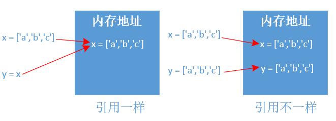 >>> print('x 和 y是否在内存地址引用同一对象(id):',x is y)
