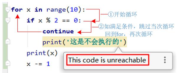 for x in range(10): if x % 2 == 0: continue print('这是不会执行的') #永远都不会执行 print(x) x -= 1 # 输出结果如下: 1 3 5 7 9 -