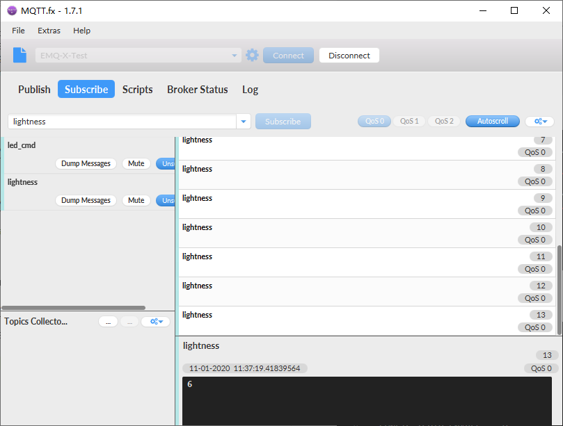EMQ-X服务器有心跳机制,实际应用中订阅之前应该先检查连接状态,本实验中暂不检查。