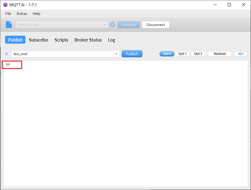 在mqtt.fx中下发一条开启命令: