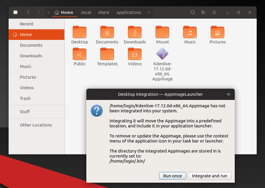 点击 “Integrate and run”,这个 AppImage 就被复制到 ~/.bin/ (家目录中的隐藏文件夹)并添加到菜单中,然后启动该程序。