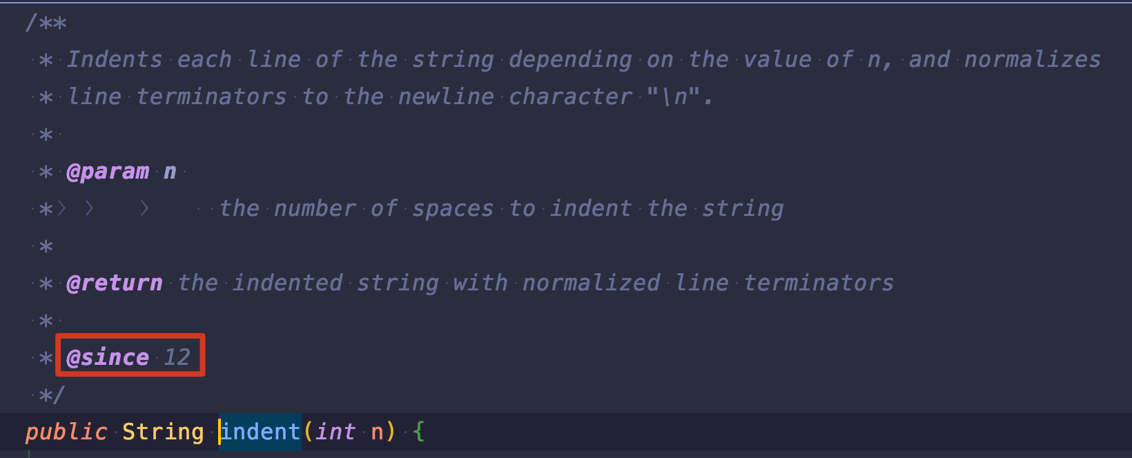 indent 「缩进」这个单词大家很熟悉了,这是Java12处理字符串的新功能,先来看方法定义: